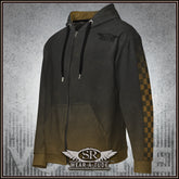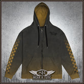 The sleeves hit with a worn-in, checkerboard strip that feels straight out of underground show posters and alleyway stickers. The whole hoodie has that perfectly weathered, lived-in look—as if it’s survived a thousand loud nights and still stands strong.